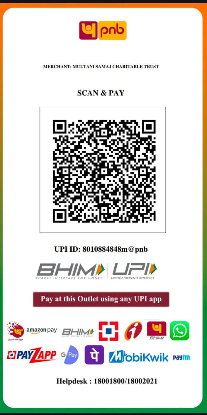 Bank Name: Punjab National Bank Account Holder Name: MULTANI SAMAJ CHARITABLE TRUST A/C No. 13332191075845 IFSC:- PUNB0225600 Branch :- Yamuna Vihar, Delhi-110053